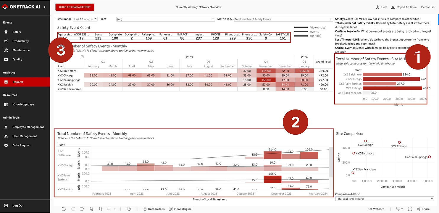 Lastly, do a site comparison on this dashboard view, and filter by “Total safety events”. This stack ranks your warehouse safety events by site while taking into account how many MHE are actually at each site.