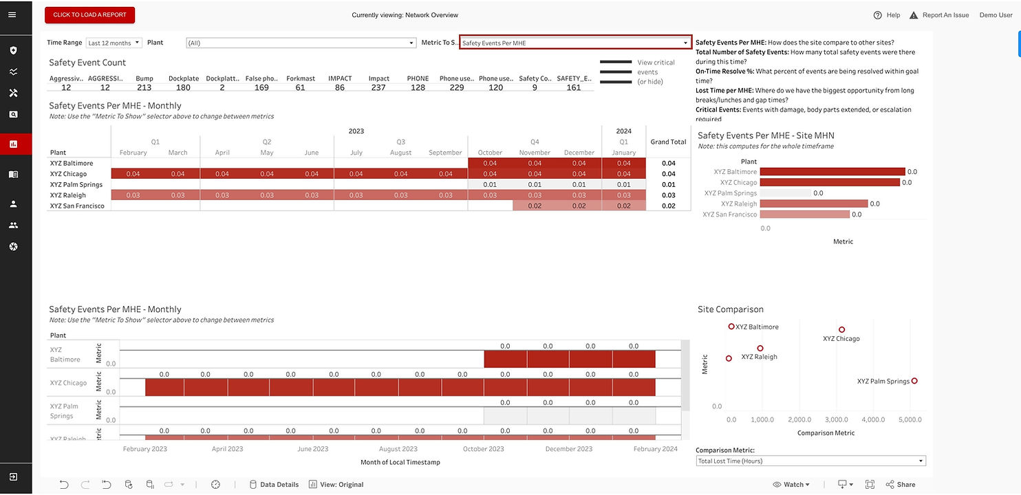 The next piece to check is to filter the dashboard by “Safety Events per MHE”. This will show you the same data, but this time taking into account the number of MHE at each site so you can see the true safety value of each site.