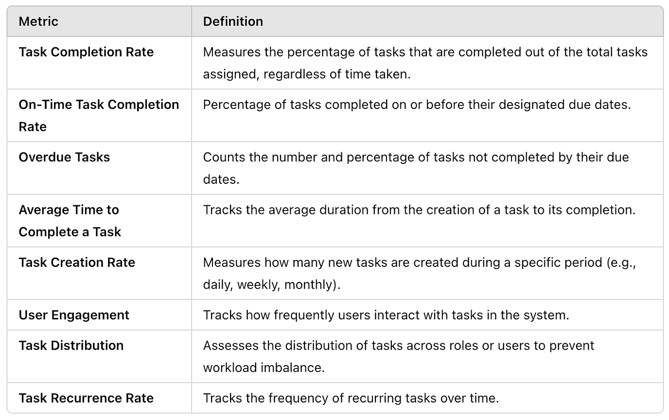 In addition to your site and team specific performance goals, below are some additional task management KPIs for enhanced visibility into task progress, enabling proactive leadership, better decision-making, and continuous improvement in warehouse performance.
